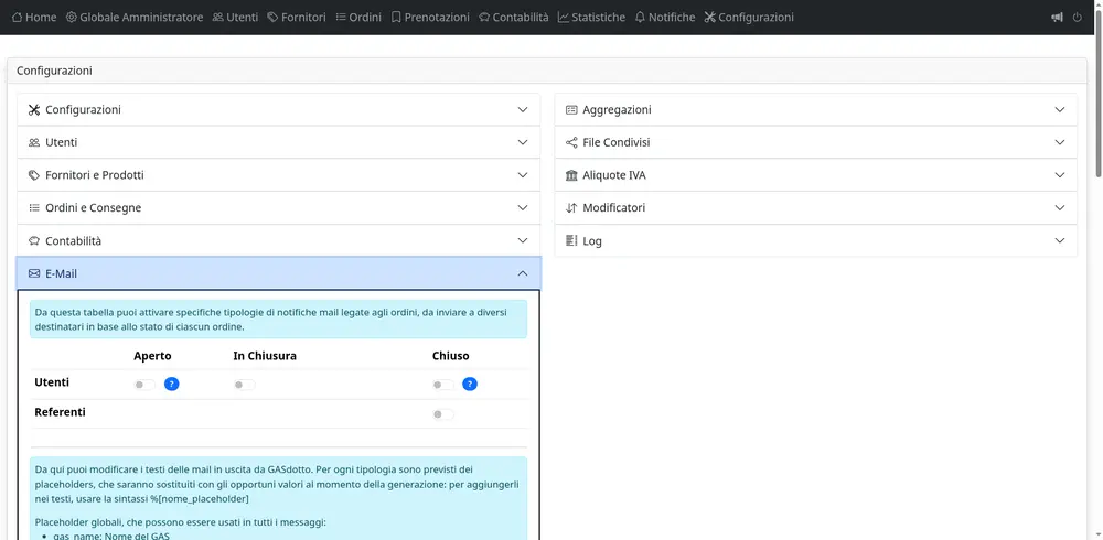 Dal pannello si possono abilitare email automatiche che si innescano all'apertura di ogni ordine, in prossimità della loro chiusura, e alla loro effettiva chiusura automatica. In quest'ultimo caso, i destinatari sono solo coloro che hanno partecipato all'ordine e per ciascuno viene allegato il riassunto della relativa prenotazione.